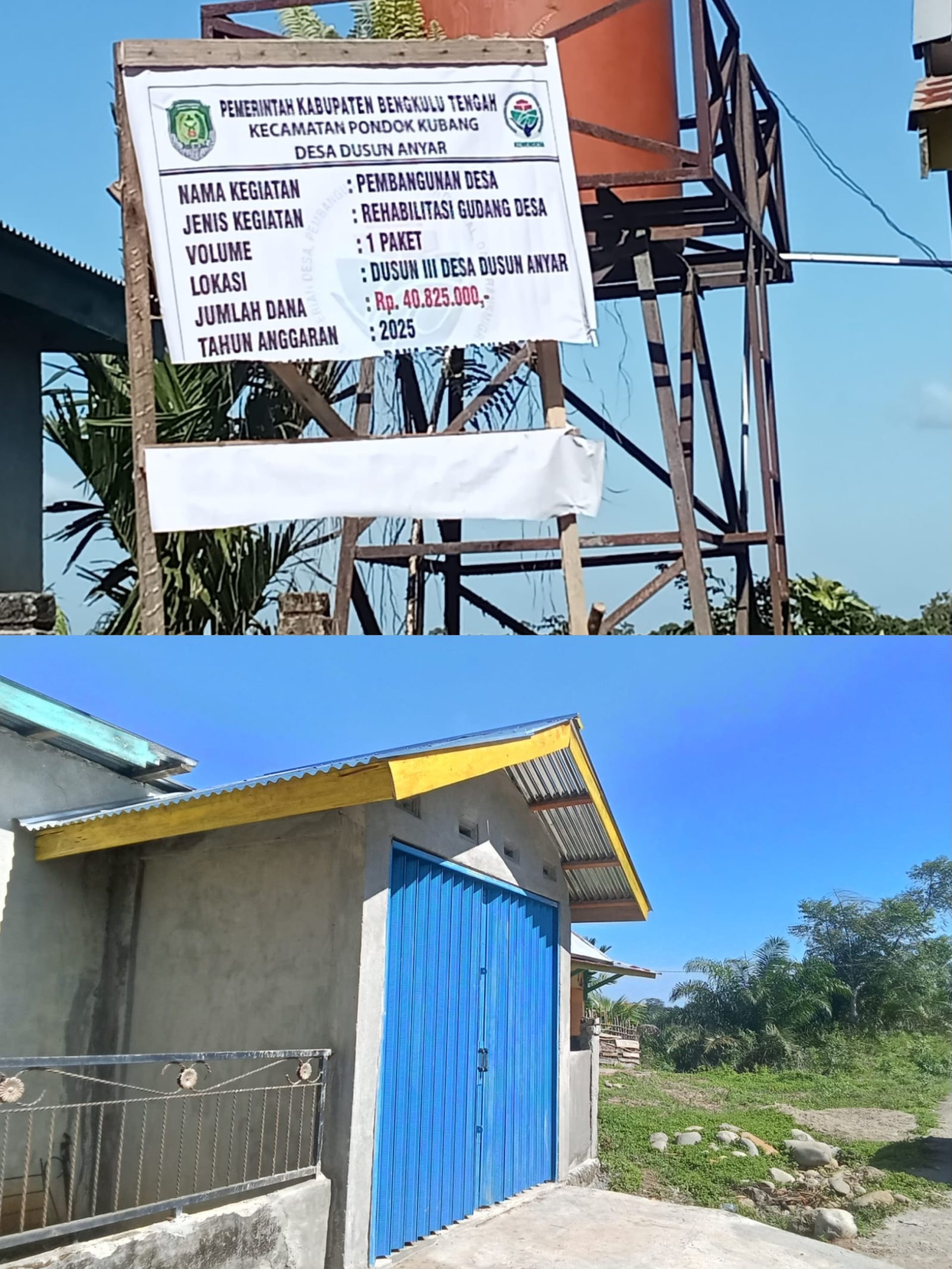 Bengkulu Tengah swara-terkini.com 12/08/2025– Proyek rehabilitasi gedung desa di Dusun III, Desa Dusun Anyar, Kecamatan Pondok Kubang, Kabupaten Bengkulu Tengah, menuai tanda tanya besar dari warga. Berdasarkan papan informasi resmi yang terpasang di lokasi, pekerjaan tersebut menggunakan anggaran sebesar Rp 40.825.000 yang bersumber dari dana desa tahun anggaran 2025, dengan volume pekerjaan satu paket.