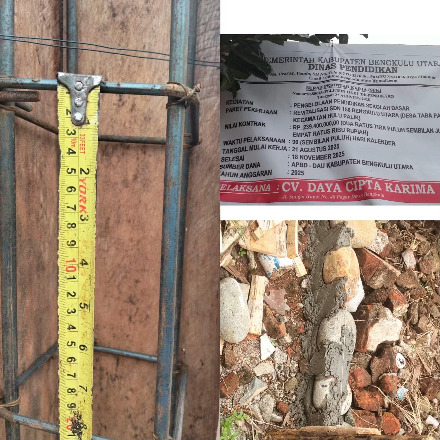 Bengkulu Utara, swara-terkini.com 30/09/2025– Pekerjaan revitalisasi SDN 156 Bengkulu Utara di Desa Taba Padang, Kecamatan Hulu Palik, kini disorot tajam oleh publik. Dari hasil peninjauan di lapangan, ditemukan sejumlah kejanggalan teknis, antara lain pondasi yang tidak digali sesuai aturan, serta jarak cincin yang tidak memenuhi standar konstruksi. Hal itu memicu keraguan terhadap kualitas hasil pekerjaan yang menelan biaya hingga Rp239,4 juta dari APBD-DAU Kabupaten Bengkulu Utara tahun anggaran 2025.