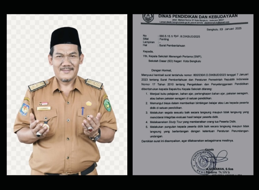 Bengkulu swara-terkini.com 31/01/2025 setelah Viral Pemberitaan Jual Buku LKS dan bupena di SDN 101 kota Bengkulu pada tanggal 22 Januari kemarin, terbit surat edaran dari dinas pendidikan kota Bengkulu pada tanggal 23 Januari yang di tanda tangani langsung oleh kepala dinas pendidikan kota Bengkulu A.gunawan S.sos